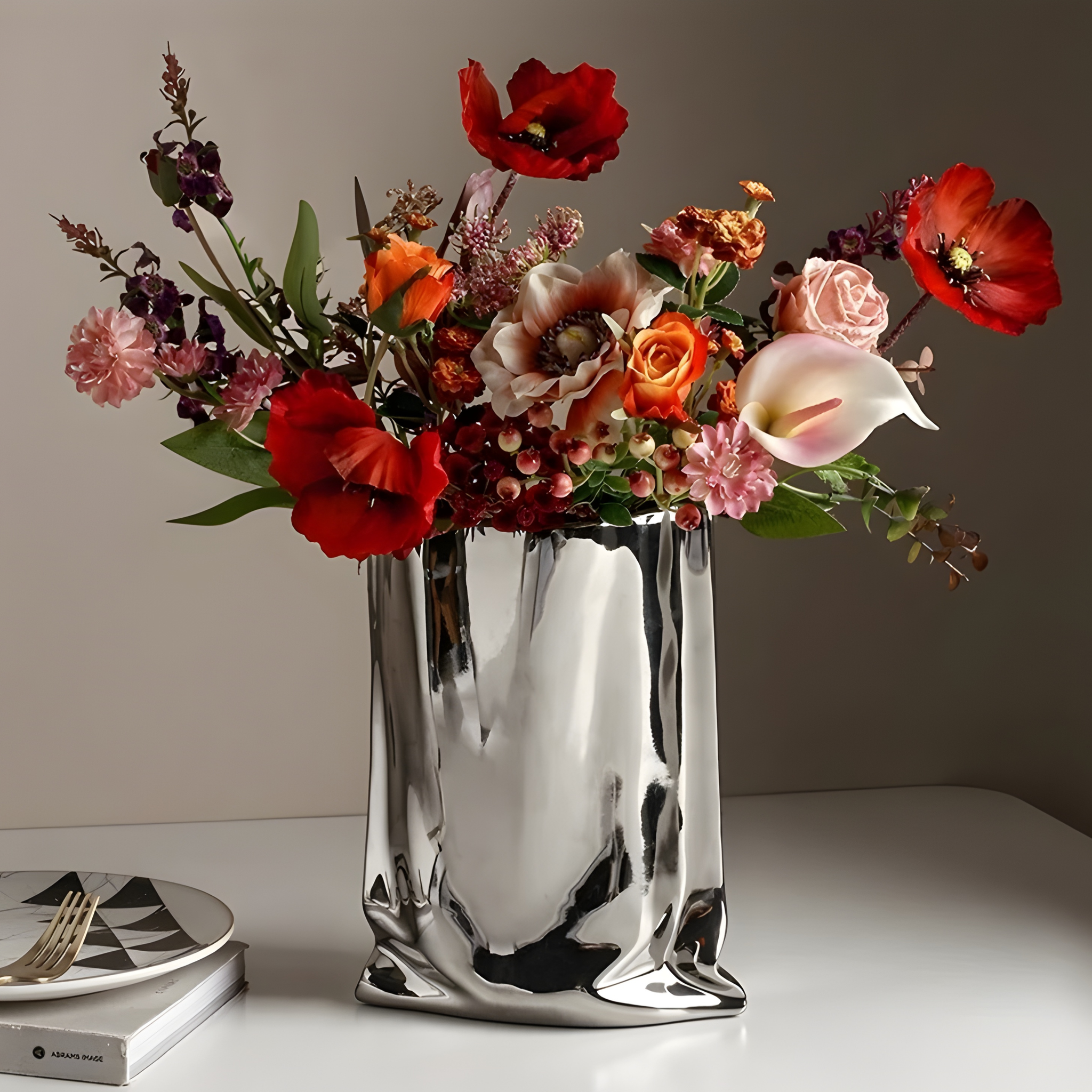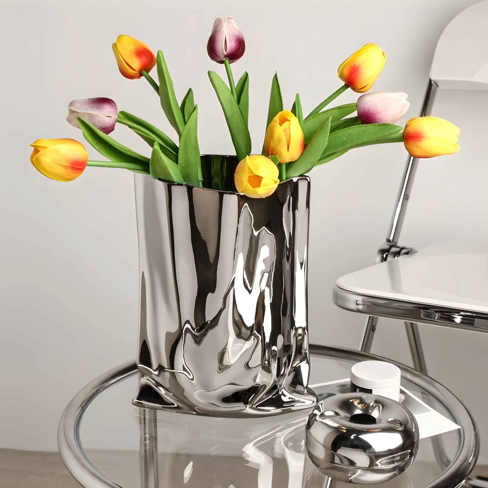 The Chrome Vase is a sculptural statement in pure reflection — crafted from premium ceramic and finished with a high-shine silver glaze. Its mirror-like surface captures and plays with light, creating depth and drama in any setting.